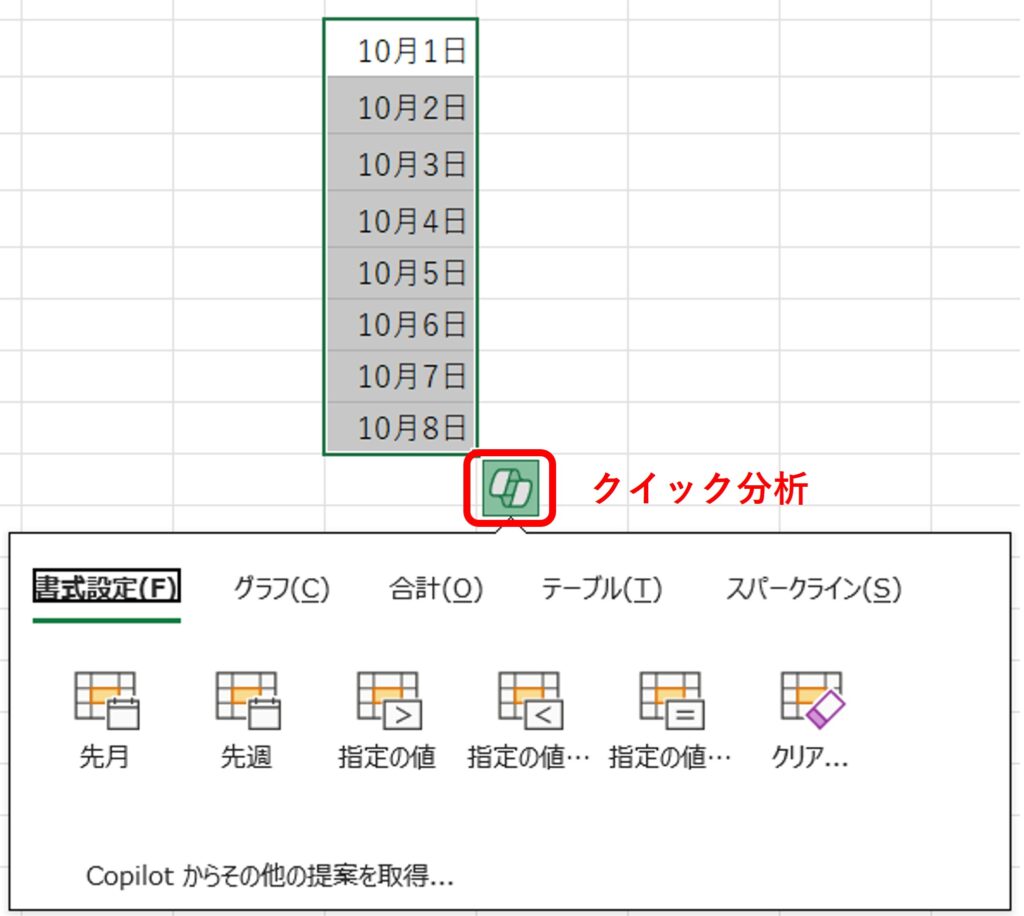 このオートフィルオプションが表示されずに、代わりに「クイック分析」が表示されてしまうことがあります。