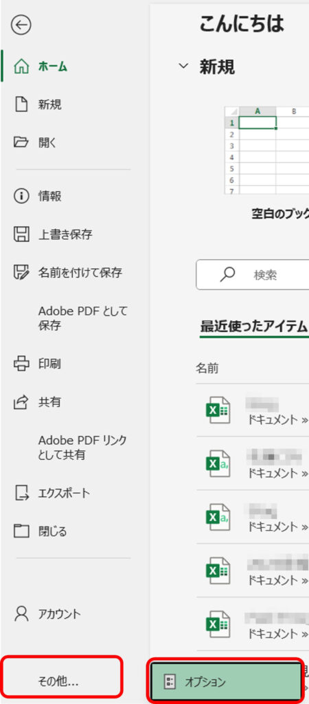 「ファイルタブ」>「オプション」とクリック。