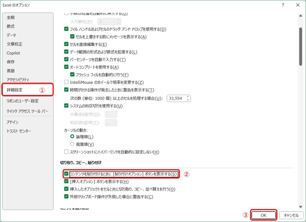 「コンテンツを貼り付けるときに[貼り付けオプション]ボタンを表示する」にチェックする。