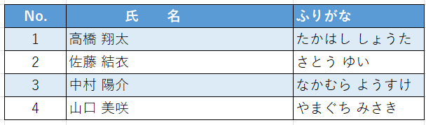 No.,氏名,ふりがな