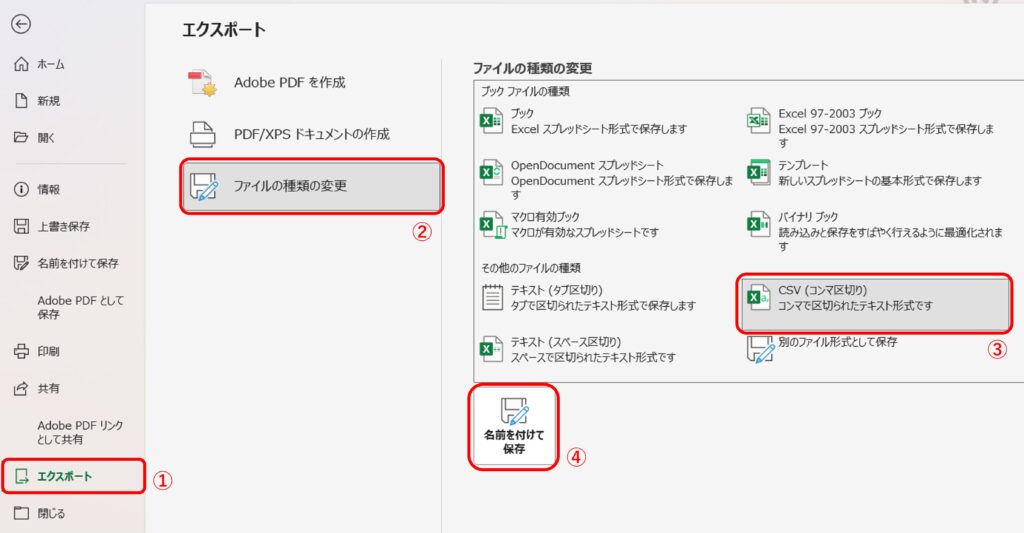 「エクスポート」>「ファイルの種類の変更」>「CSV(コンマ区切り)」>「名前を付けて保存」と順にクリック。