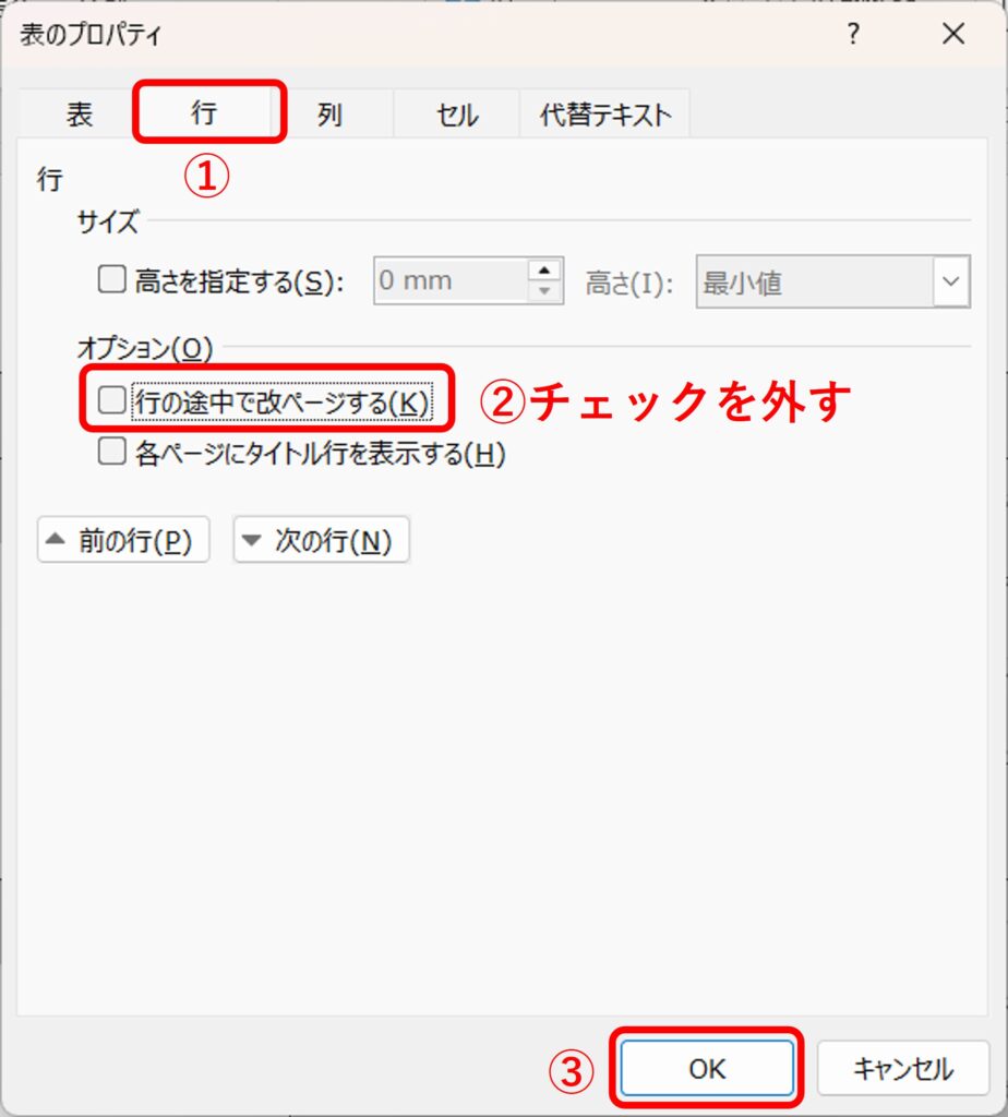 そこで、行の途中で改ページさせないような設定は「表のプロパティ」から行います
