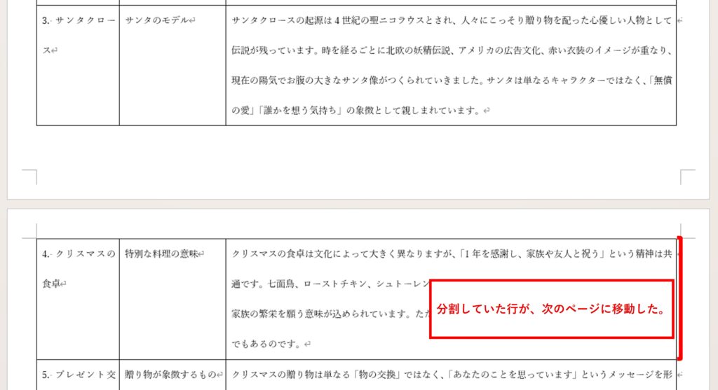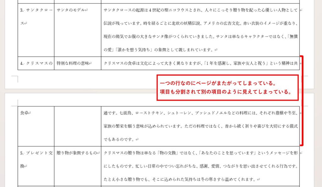 一つの行なのにページがまたがってしまっています。項目も分割されてしまっていて、別の項目のように見えてしまっています。