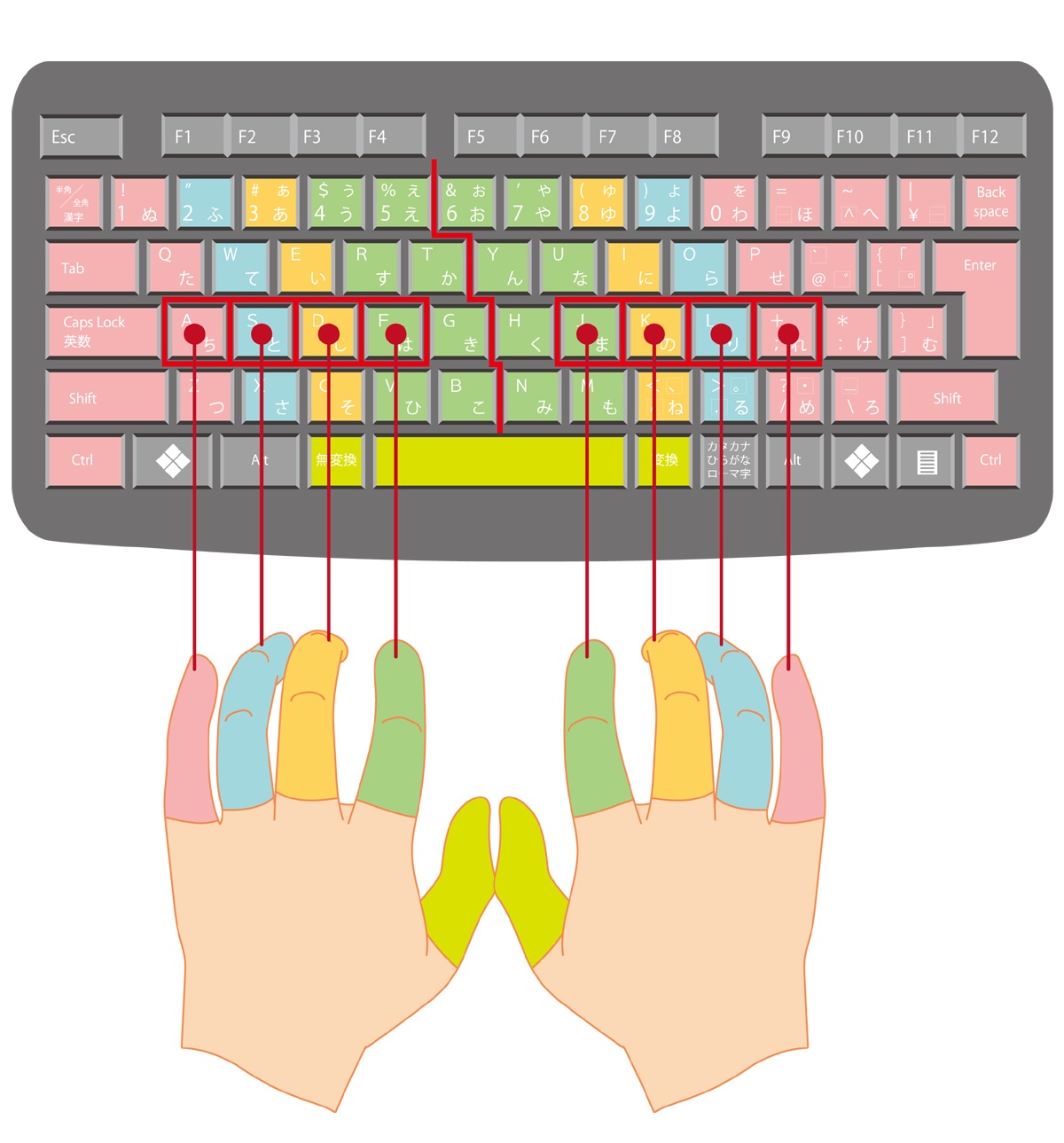 「F」キーに左手人差し指、「J」キーに右手人差し指を置き、そこから中指、薬指、小指を順番に次のキーに置いてください。